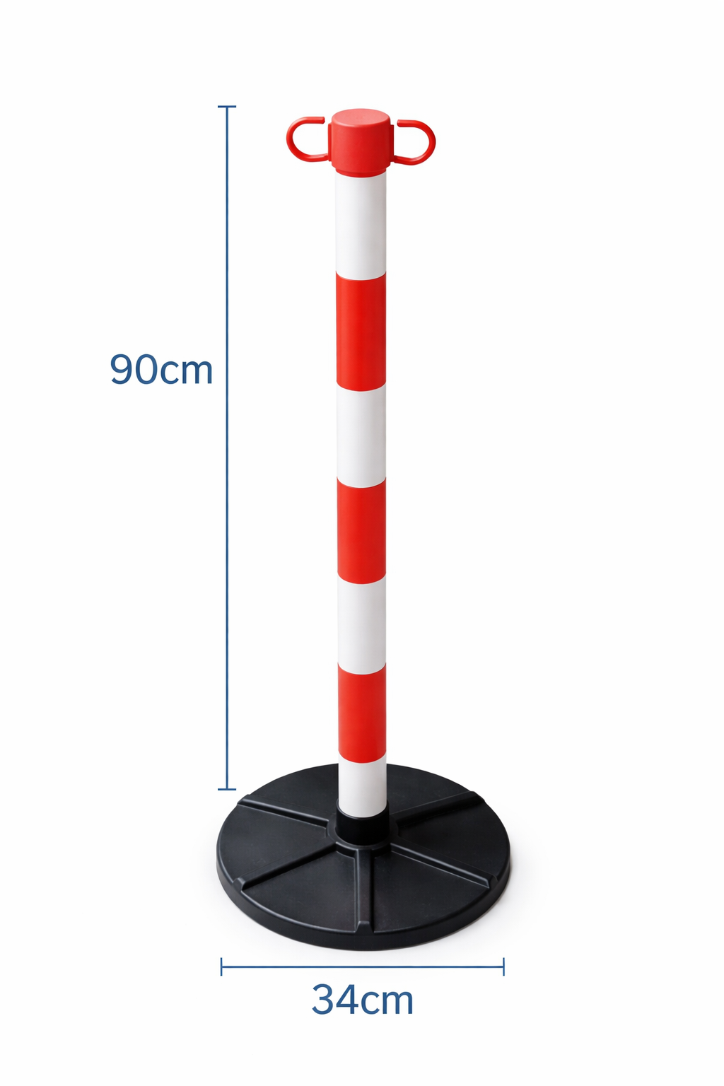 Der stabile Kunststofffuß kann zur Erhöhung der Standfestigkeit mit Sand befüllt oder einbetoniert werden und sorgt so für einen sicheren Halt. Die rot-weiße Signalfarbgebung des Pfostens gewährleistet eine sehr gute Sichtbarkeit – auch bei schlechten Lichtverhältnissen.
